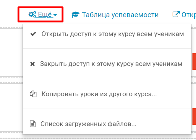 Над списком создаваемых уроков нажмите Еще, в выпадающем меню выберите пункт Открыть или Закрыть доступ к этому курсу всем ученикам.