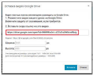 Если файл загружен в стороннее хранилище, то для его встраивания в урок должен выдаваться специальный код. В этом случае в уроке отобразится плеер хранилища. Во многих из них можно задать запрет на скачивание файла.