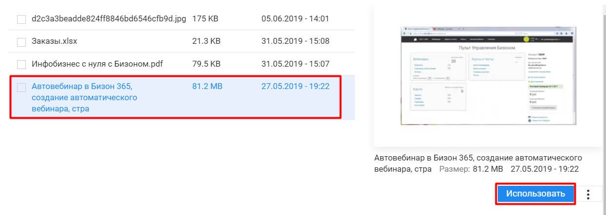 Выделите нужный файл и нажмите на кнопку Использовать.