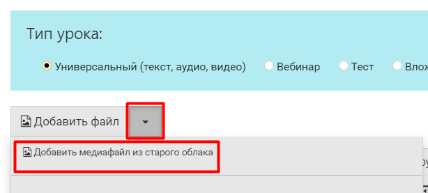 2.1. Чтобы добавить файл из Облака, нажмите на кнопку со стрелкой справа от кнопки Добавить файл. В открывшемся окне выберите Добавить медиафайл из старого облака.