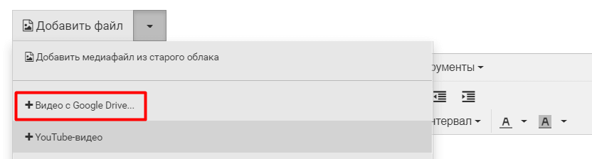 6. Перейдите в редактор урока и выберите из раскрывающего списка +Видео с Google Drive...