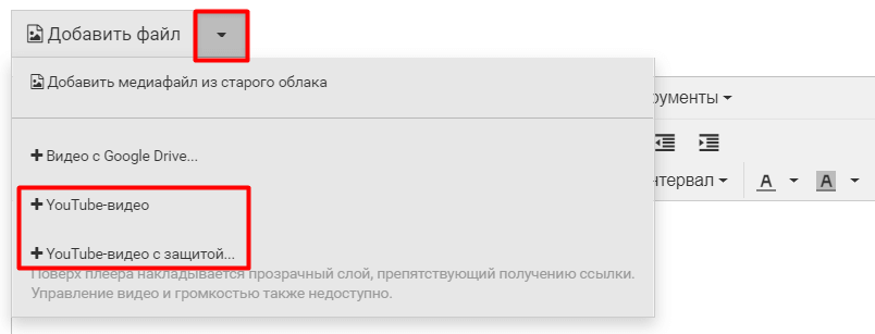 Для вставки видео с YouTube выберите из раскрывающегося списка какое видео будет использоваться в уроке - с защитой или без.
