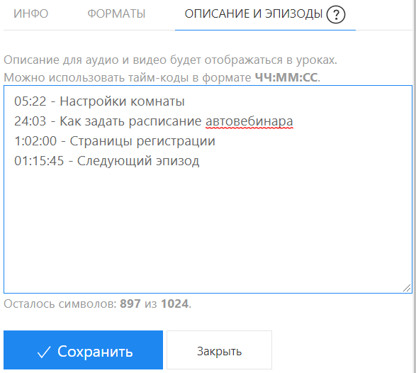 В открывшемся поле введите время начала каждого эпизода в формате ЧЧ:ММ:СС или ММ:СС и добавьте текст с описанием. В поле можно ввести 1024 символа.