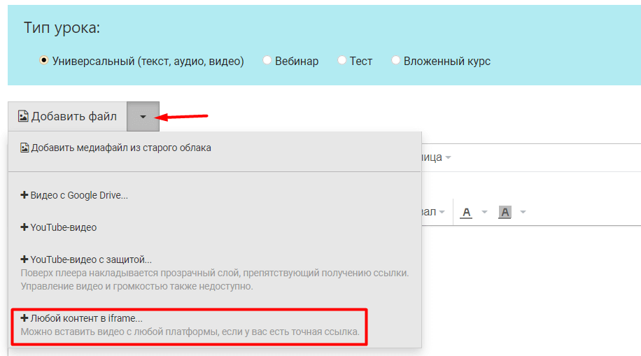 Перейдите в редактор урока. Нажмите на кнопку рядом с кнопкой Добавить файл. В выпадающем меню выберите пункт +Любой контент в iframe...