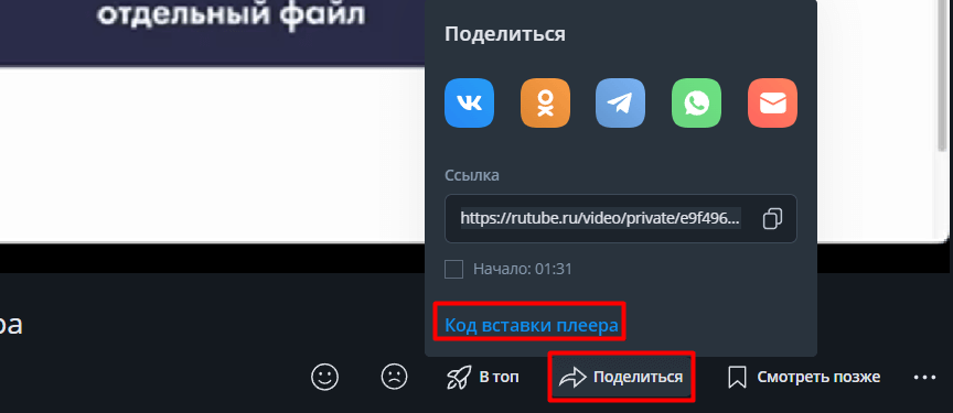 Откроется новая страница с видео. В меню под видео нажмите на кнопку Поделиться и затем на Код вставки плеера.