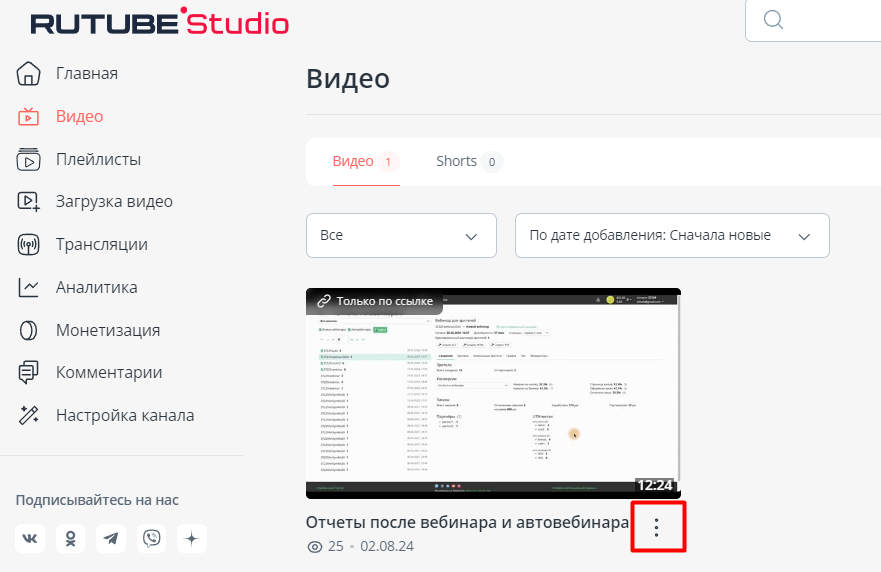 В студии RUTUBE нажмите на три вертикальных точки рядом с названием видео.