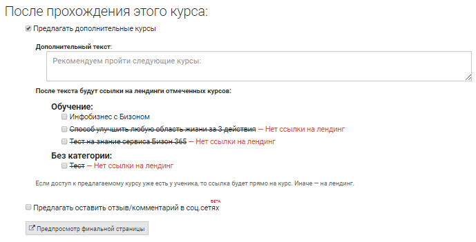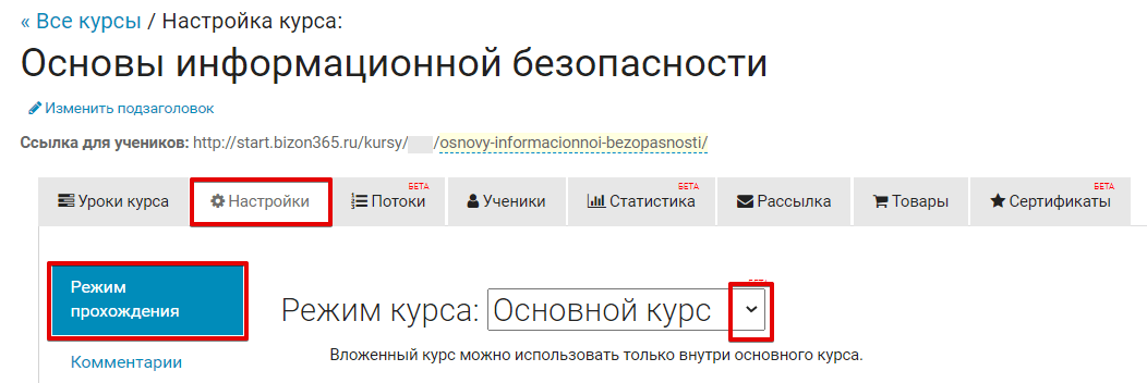 Ссылка на курс для учеников приведена в строке Ссылка для учеников под заголовком курса. Она имеет формат: https://start.bizon365.ru/kursy/XXXX/КУРС/