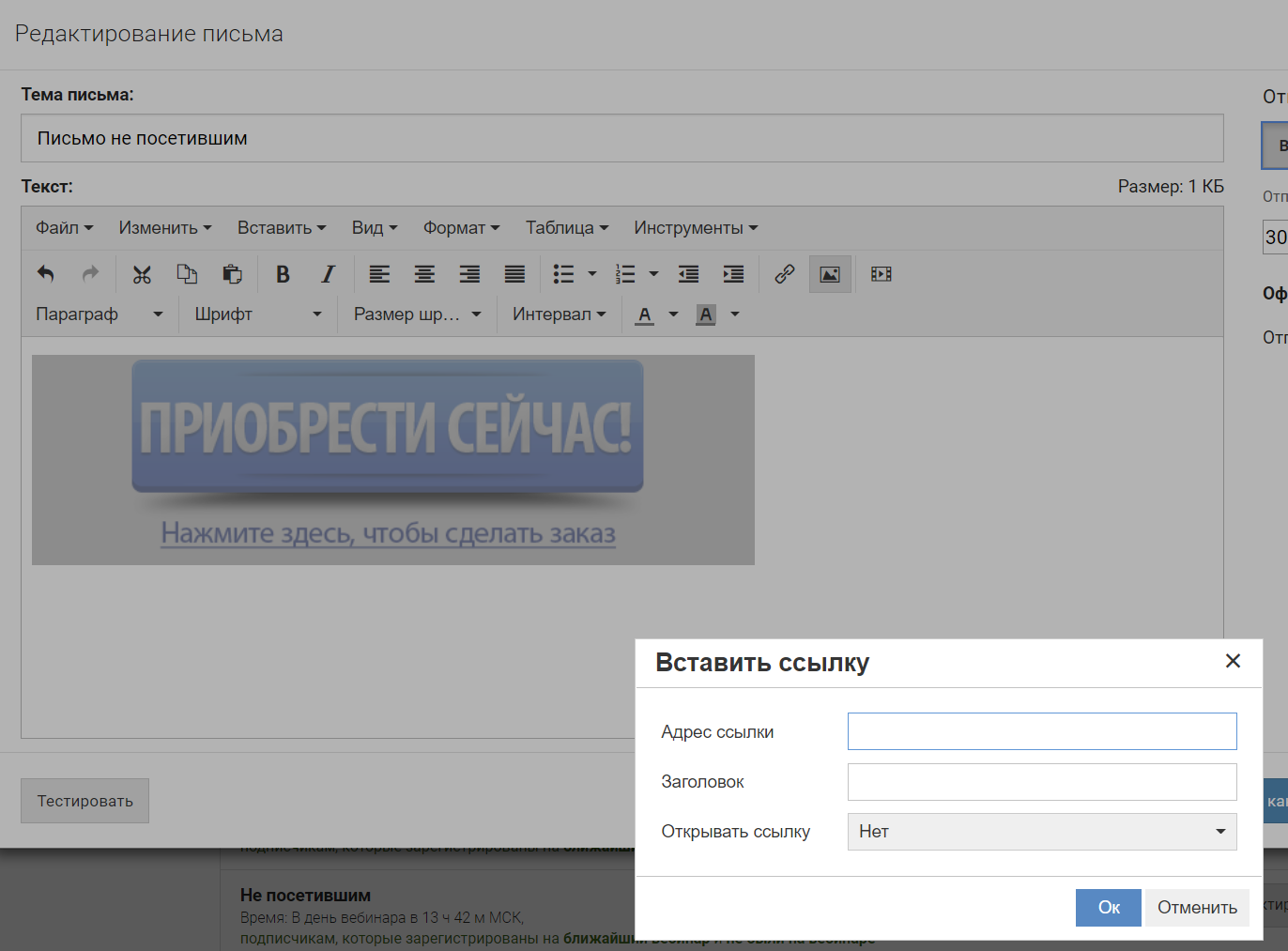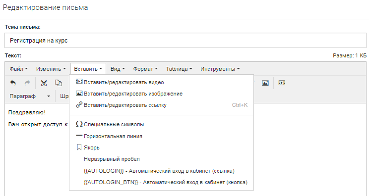 Интерфейс редактора писем аналогичен редактору писем в разделе «Страницы регистрации» сервиса.