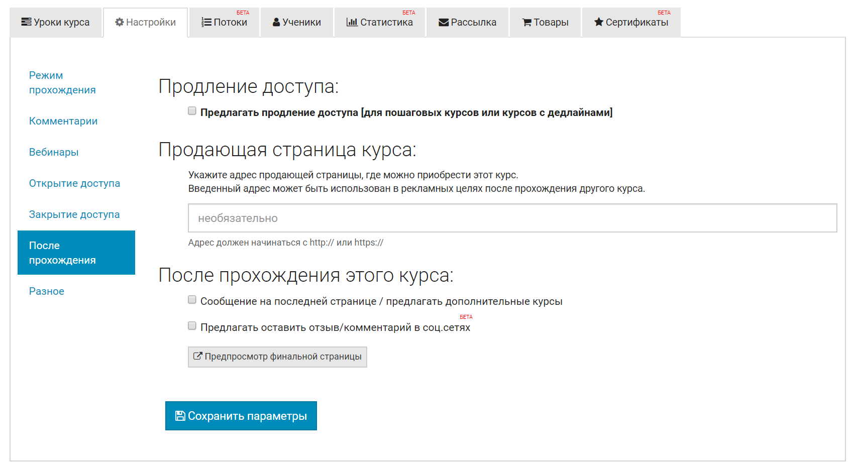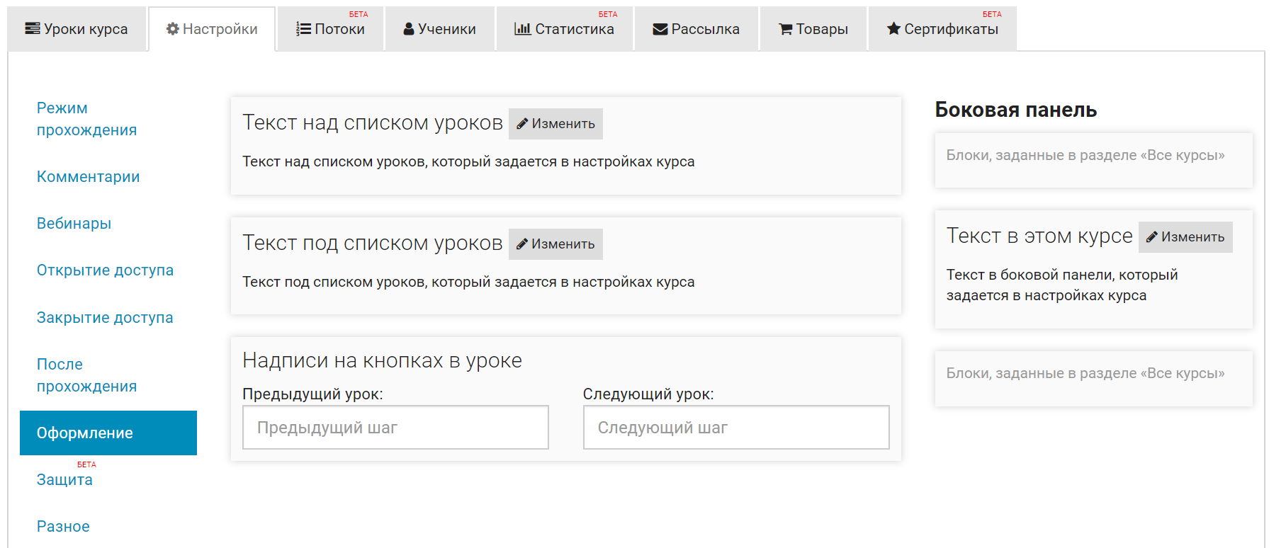 Переходим к настройкам курса. Рекомендуем начать с вкладки Настройки и её разделов, а уже затем перейти к Урокам курса, т.к. настройки отдельного урока будут зависеть от общих настроек курса.