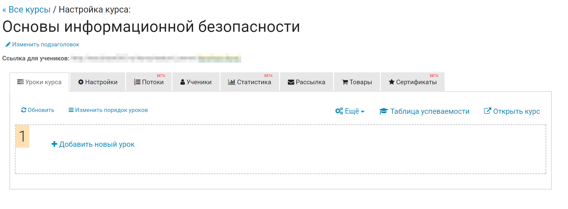 Нажмите на название курса, чтобы перейти к его настройке и добавлению уроков.