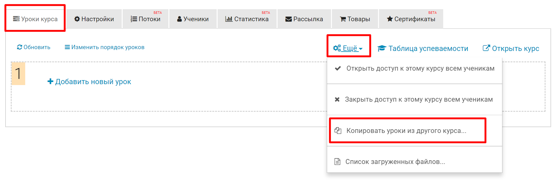 Если вы хотите скопировать уроки из другого курса, над списком создаваемых уроков нажмите Ещё, в выпадающем меню выберите пункт Копировать уроки из другого курса.
