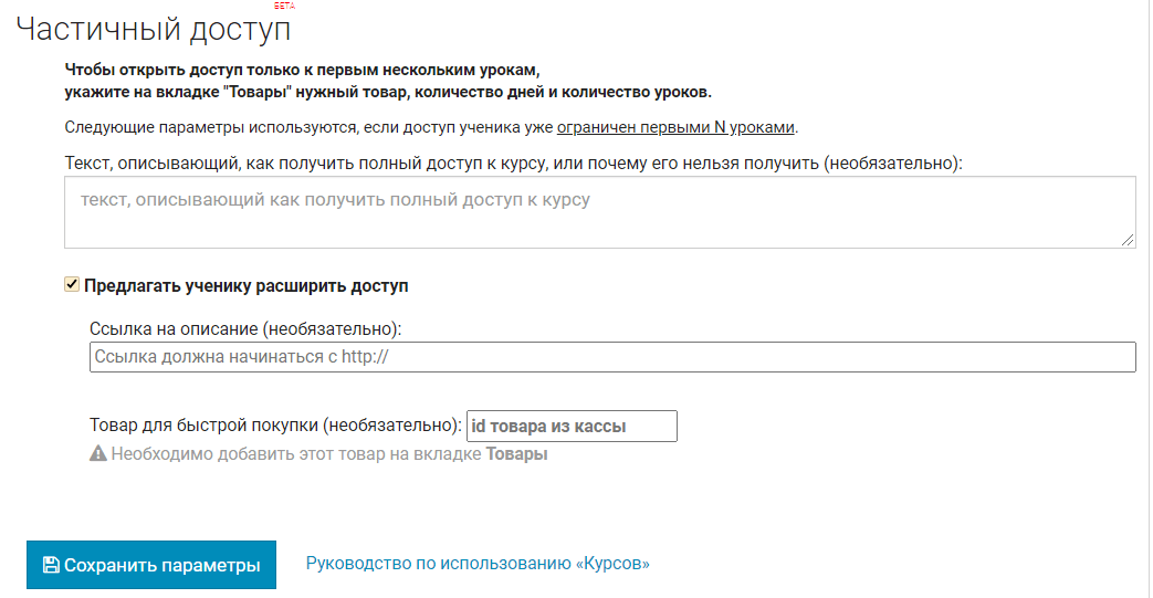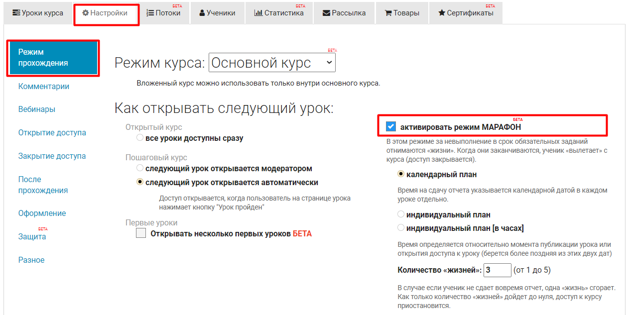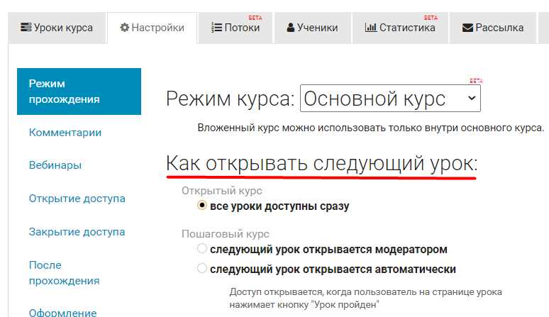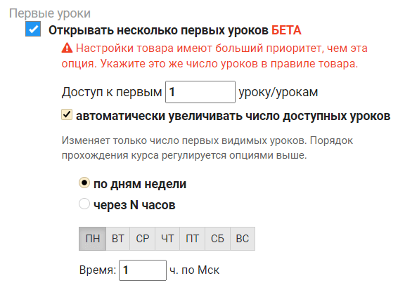 Укажите, сколько первых уроков будет доступно сразу. Поставьте галочку в автоматически увеличивать число доступных уроков и выберите режим открытия следующих уроков.