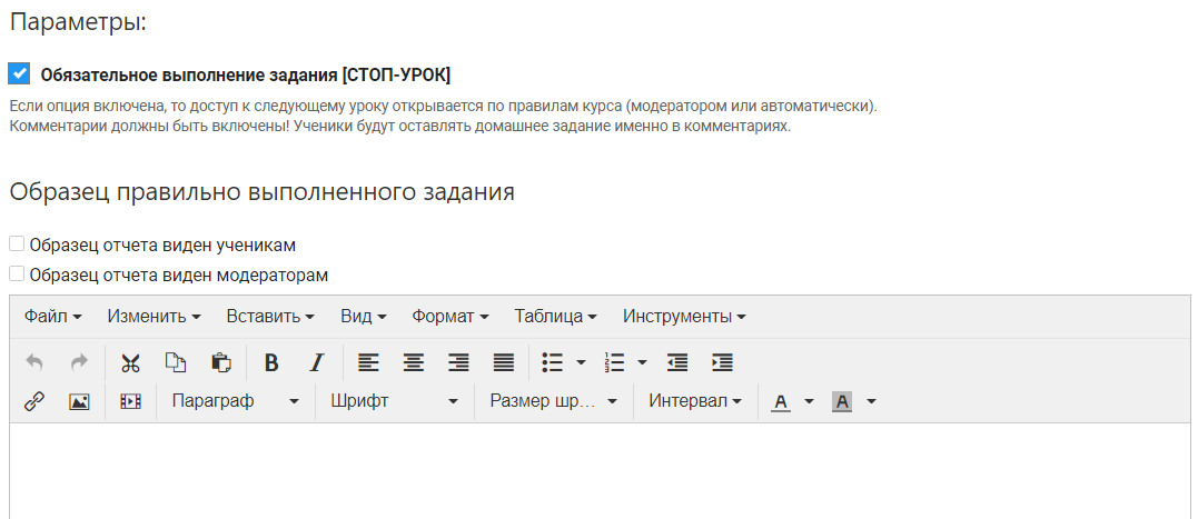 Если при прохождении урока ученики должны выполнить домашнее задание, в разделе Параметры включите опцию Обязательное выполнение задания [СТОП-УРОК]. Опция включается автоматически для пошаговых курсов. Если выполнение домашнего задания необязательно, снимите галочку с опции.