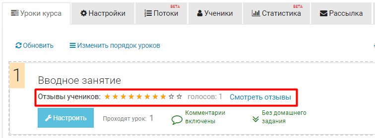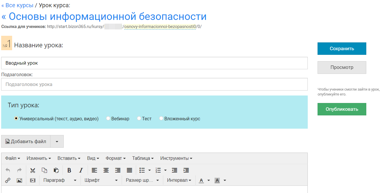 Поздравляем, вы создали первый урок! Чтобы вернуться к списку уроков нажмите на название курса.