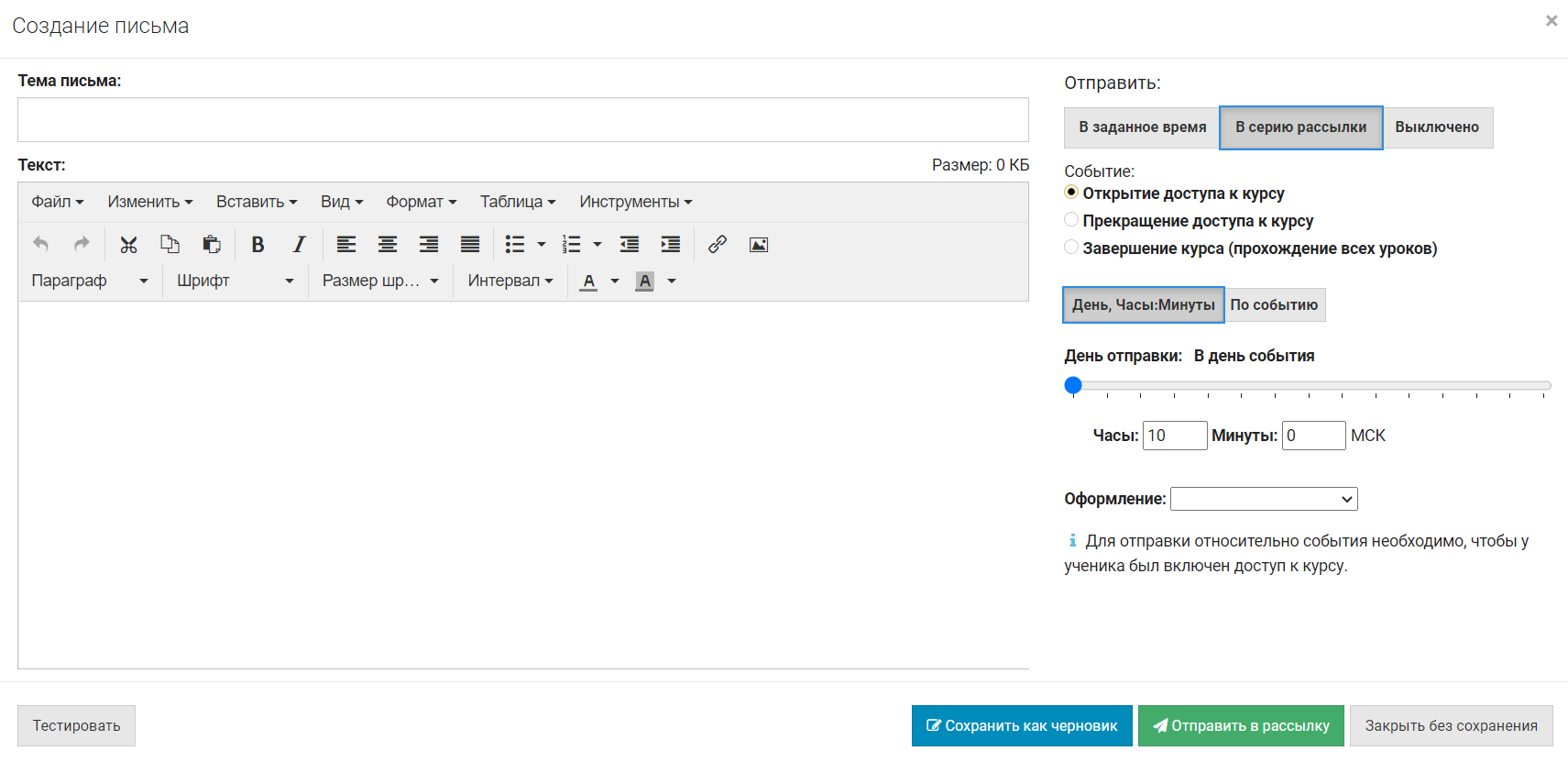 В этом разделе можно создать письма, которые будут отправлены разово в указанное время или же помещены в серию рассылки.