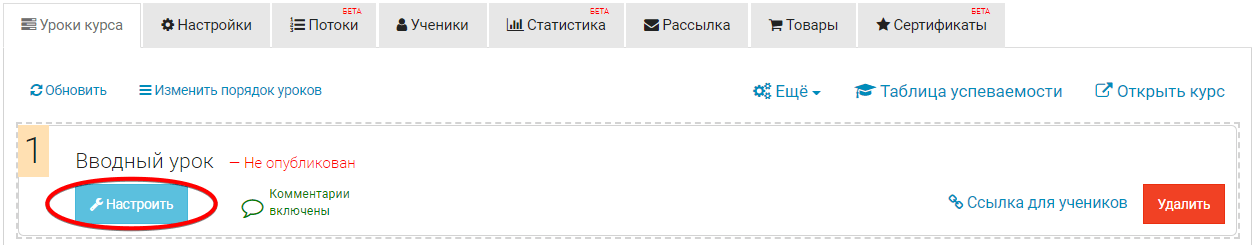 В примере ниже мы ввели название «Вводный урок». Нажмите кнопку Настроить, чтобы перейти в настройки урока.