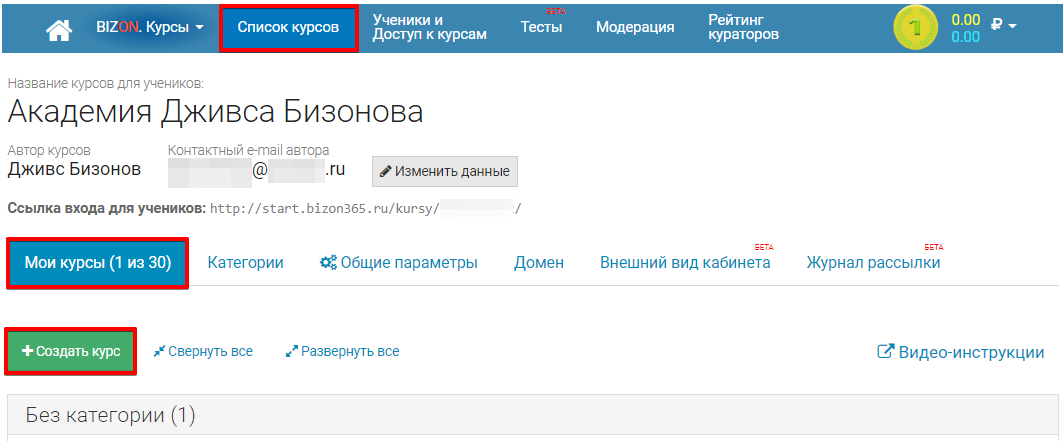 Список курсов во вкладке Мои курсы нажмите на кнопку +Создать курс.