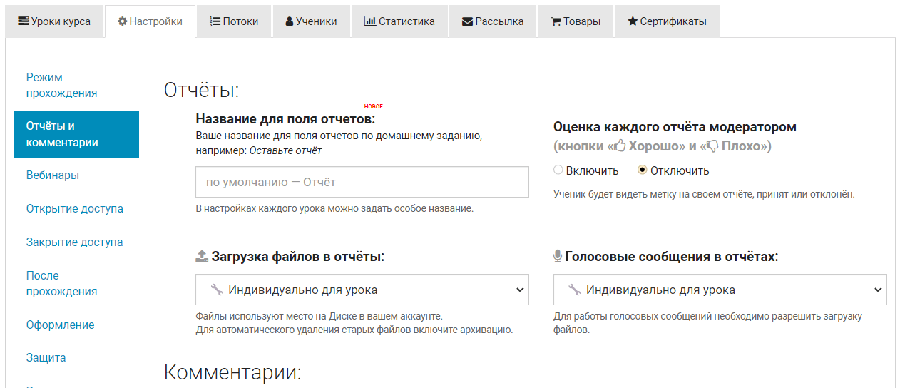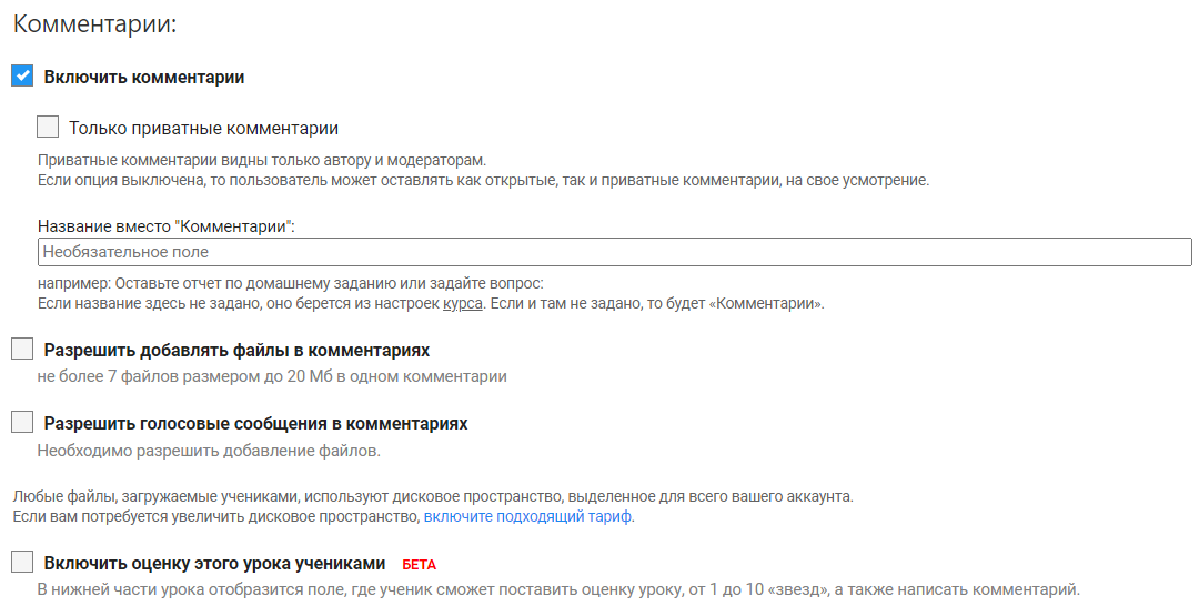 Ниже находится опция Включить комментарии. При включении у учеников появляется возможность оставлять свои комментарии под материалом урока. Опция доступна, если в настройках курса в разделе Комментарии выбран режим Индивидуально для урока (о режимах рассказывается здесь>>).
