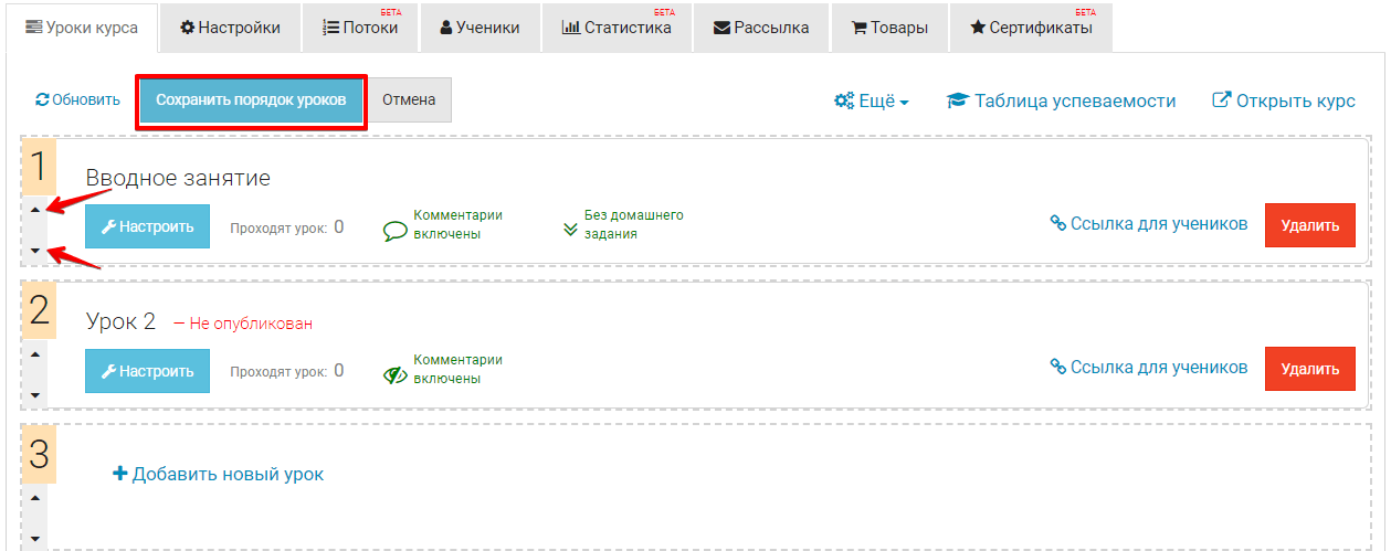 Если нужно поменять уроки местами, нажмите на Изменить порядок уроков над списком уроков. Нажимайте стрелки вниз или вверх, передвигая урок в нужный слот. Обязательно сохраните новый порядок уроков, нажав на соответствующую кнопку.