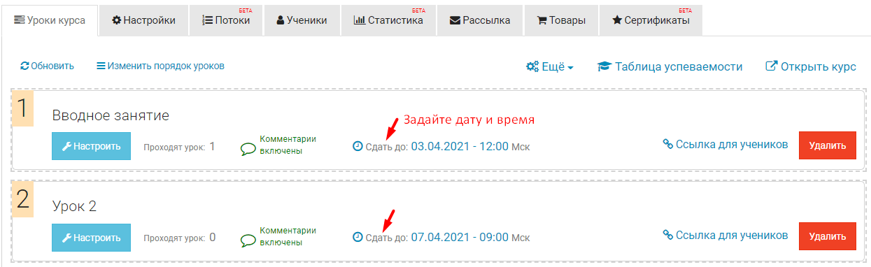 - здесь же можно получить ссылку на любой из уроков, не заходя в настройки урока