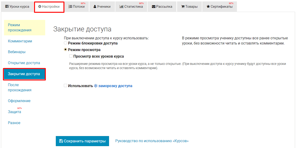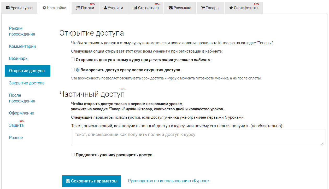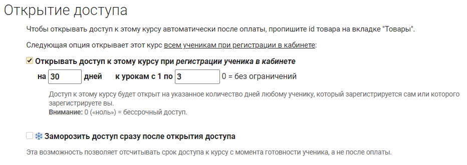 - Открыть и закрыть доступ к этому курсу всем зарегистрированным ученикам.