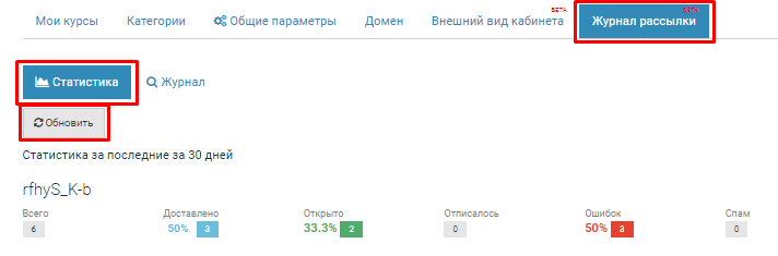 В общих настройках можно проверить доставляемость писем. Для просмотра статистики зайдите в Журнал рассылки -> Статистика -> Обновить. Данные будут выглядеть следующим образом: