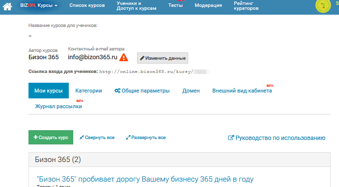 Здесь расположен список ваших курсов. О создании нового можно прочесть здесь>>