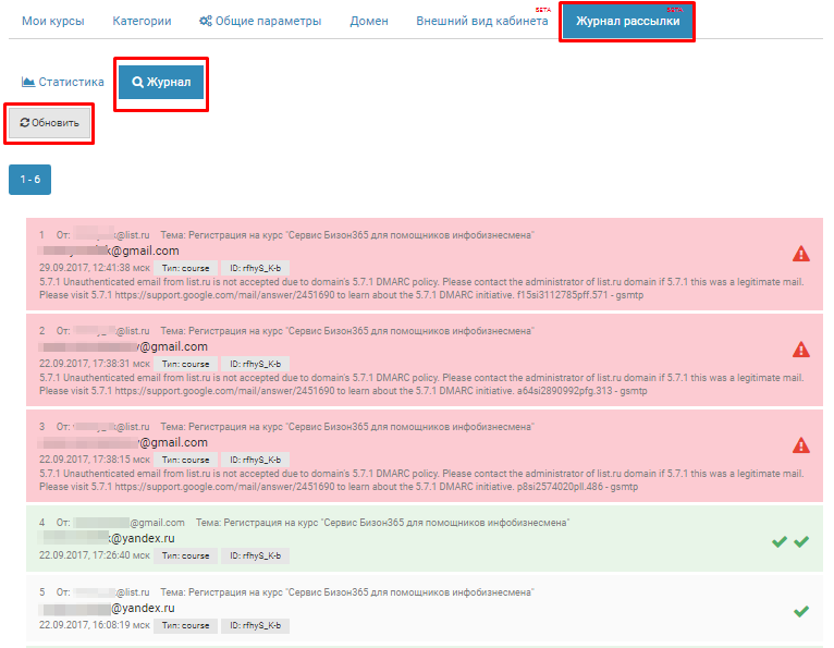 Для сведений по каждому письму переходите в Журнал и еще раз нажмите Обновить. Доставленные письма будут помечены серым цветом и одной галочкой, открытые - зеленым и двумя галочками, а недоставленные - красным с причиной ошибки.