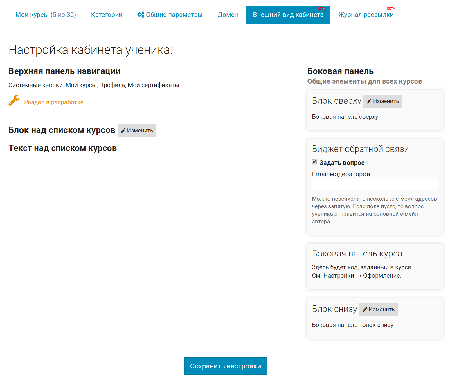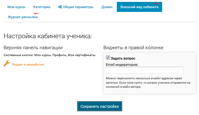 - В общих настройках курса нужно выбрать опцию Внешний вид кабинета и прописать текст, который будет видеть ученик в своем кабинете