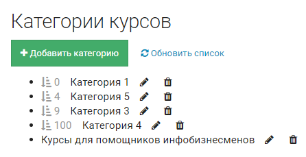Когда курсов много и их можно объединить по какому-то признаку, например, общей темой, полезно использовать категории. Нажмите на кнопку Добавить категорию и введите её название и вес.