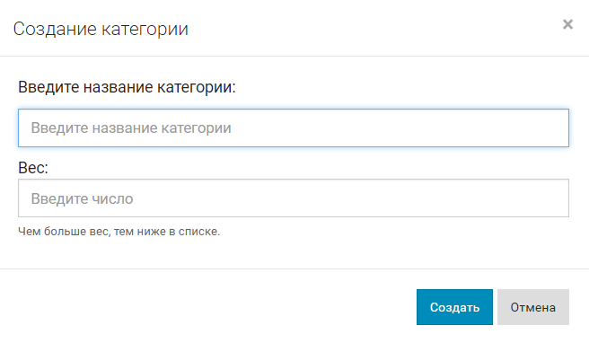Вес используется для сортировки и отображения списка категорий в удобном для вас порядке. Чем больше вес, тем ниже в списке будет находиться категория. Вес категории отображается слева от её названия. Категории без указания веса будут находиться в самом низу списка.