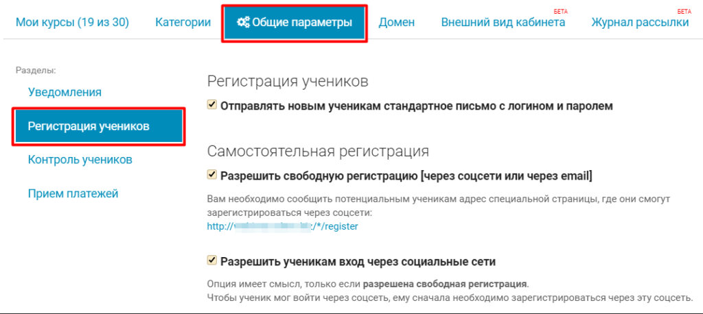 В подразделе Регистрация учеников можно настроить отправку письма с логином и паролем новым ученикам.