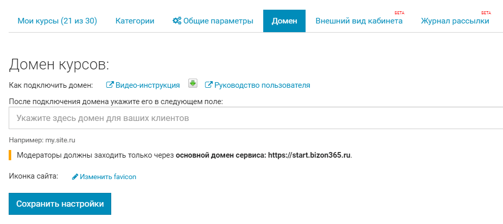 После подключения домена по Инструкции в этом разделе необходимо прописать свой домен для формирования ссылок системой.