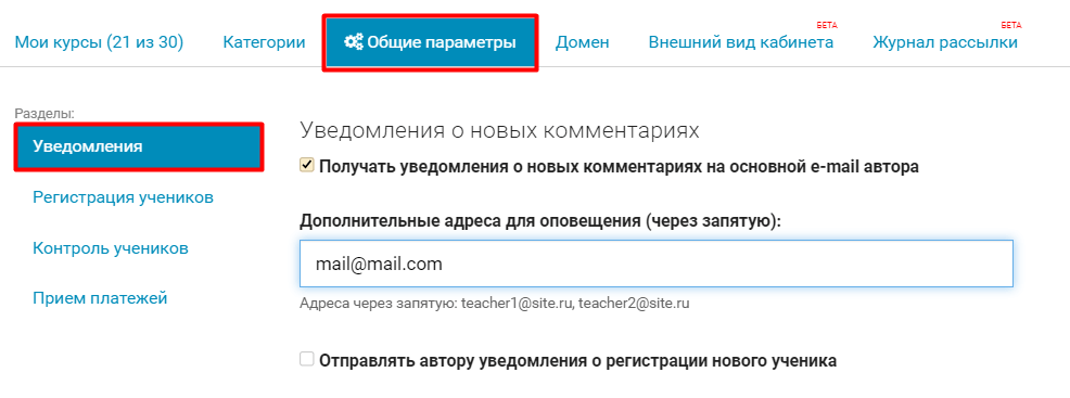 В этом разделе можно настроить получение уведомлений о новых комментариях на основной и дополнительные e-mail. Также есть возможность получения уведомлений о регистрации, в том числе самостоятельных.