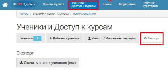 Для того, чтобы скачать список учеников, нажмите соответствующую кнопку во вкладке Экспорт.