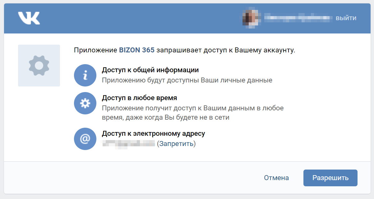 Нажав на значок желаемой соцсети, ученик увидит окно, где ему нужно разрешить доступ к информации своего аккаунта. При этом он может разрешить или запретить доступ к электронному адресу:
