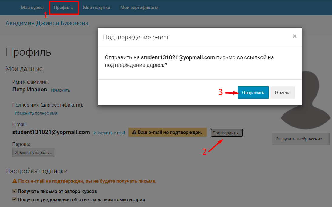 Здесь ученик может в любой момент подтвердить свой e-mail.