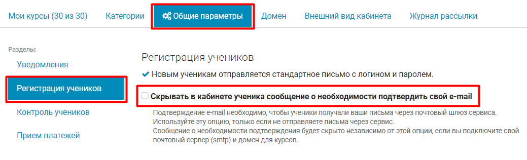 Если вы не используете рассылку сервиса для взаимодействия с учениками, сообщение можно отключить вручную в Общих параметрах курсов в разделе Регистрация учеников. Включите опцию Скрывать в кабинете ученика сообщение о необходимости подтвердить свой e-mail.