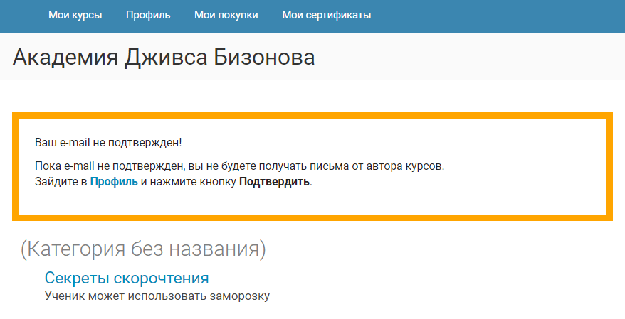 В личном кабинете над списком курсов ученик увидит сообщение о необходимости подтвердить e-mail.