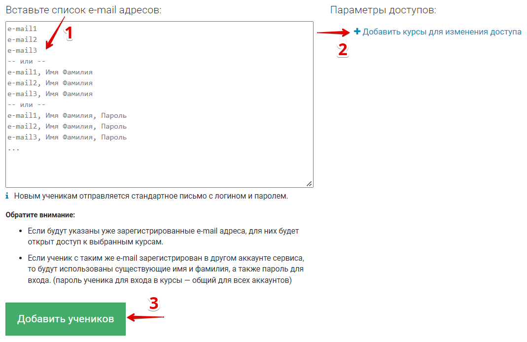 Обратите внимание: Можно указывать e-mail, которые уже существуют в вашем списке учеников. Если во время импорта обнаружится, что такой e-mail уже существует, второй раз пользователь добавляться не будет.