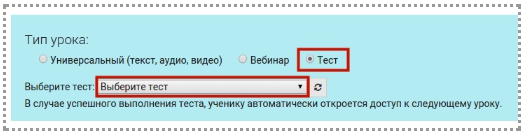 Чтобы подключить тест, войдите в редактор урока и выберите тип урока: «тест» и затем выберите тест из списка. Тест должен быть заранее создан и настроен.