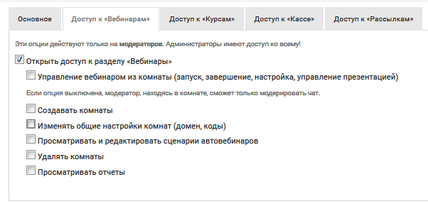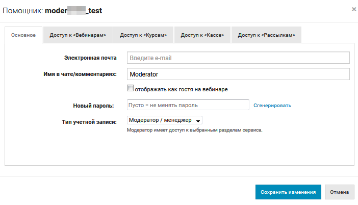В открывшемся окне можно поменять эл. почту, отображаемое имя, показывать ли модератора как гостя на вебинаре, пароль и роль в аккаунте (модератор или администратор). В следующих вкладках настраиваются нужные права доступа.