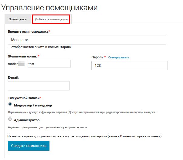 Ознакомьтесь с видео-инструкцией по созданию модератора в аккаунте: