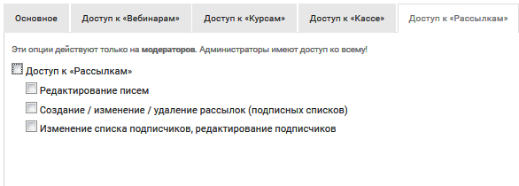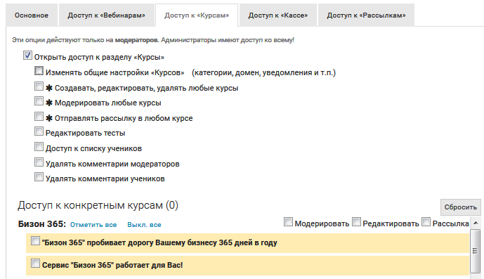 Обратите внимание: самая первая галоча "Открыть доступ к разделу ..." только открывает доступ и не дает больше никаких прав. Все нужные права отмечаются галочками, иначе модератор будет видеть пустой раздел, к которому ему предоставлен доступ.