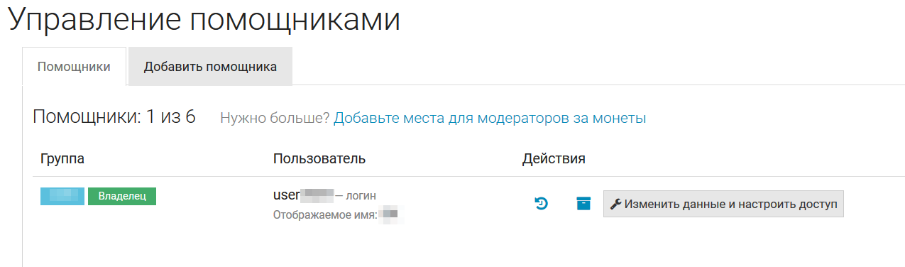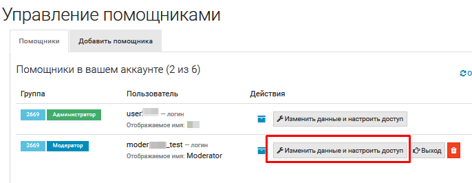 Помощники и нажмите Изменить данные и настроить доступ нужного модератора: