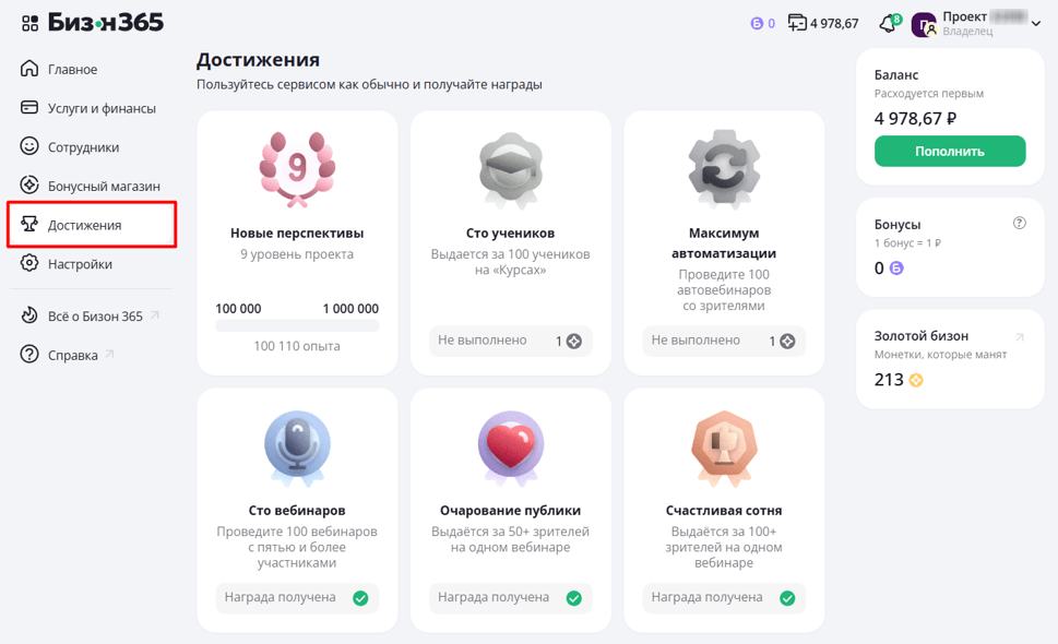 Достижения - это ваша доска целей: уровни проекта, «сто учеников», «сто вебинаров», «автоматизация на максимум» и другие задания. Делаете то, что и так планировали и получаете значки и монеты. Красиво, мотивирующе и выгодно.