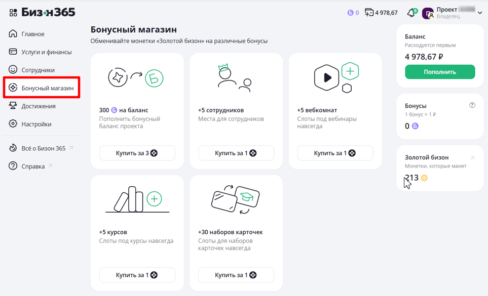 Бонусный магазин - финансовый круговорот в природе Bizon 365: приятный, понятный и слегка блестящий. Здесь монетки Золотой бизон превращаются в полезные бонусы для проекта.