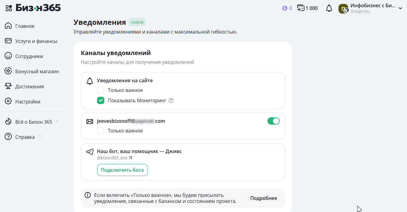 Хотите меньше шума? В каналах можно включить Только важное — тогда будут приходить критические вещи: про баланс и состояние проекта.