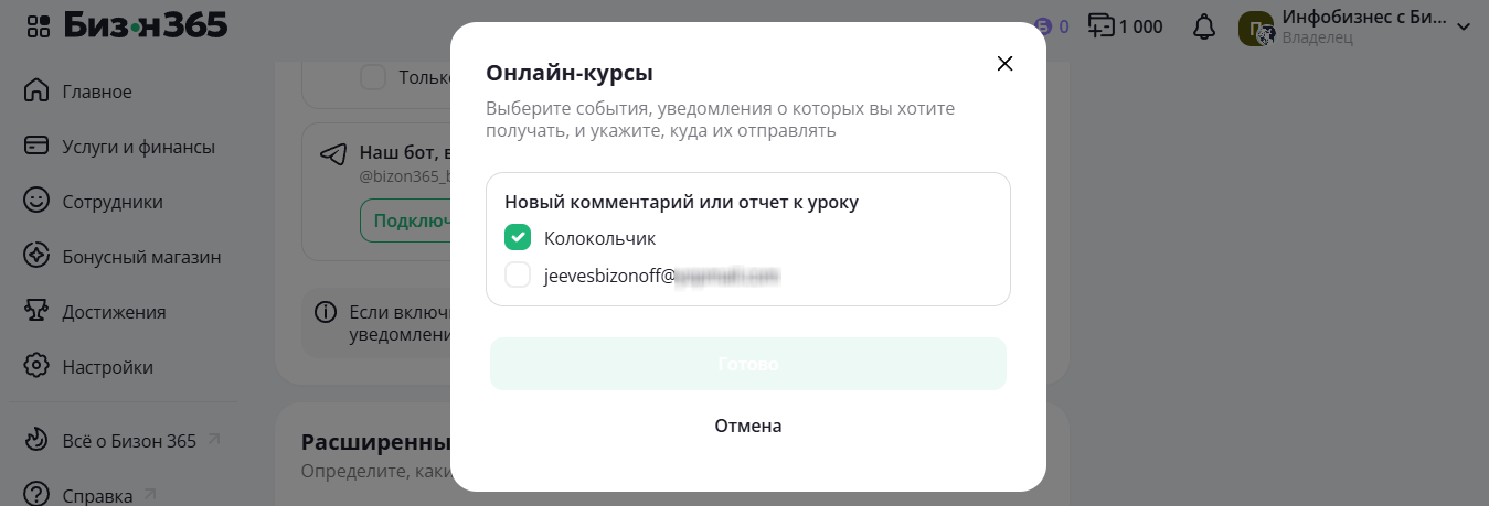 - Системный Телеграм бот - Дживс. Нажмите Подключить бота и следуйте появляющимся инструкциям.