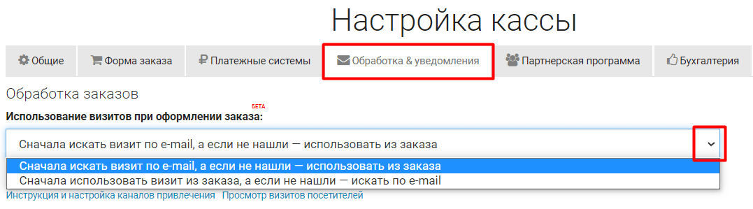 - Указать, каким способом будут использоваться визиты пользователя при оформлении заказа для определения каналов привлечения